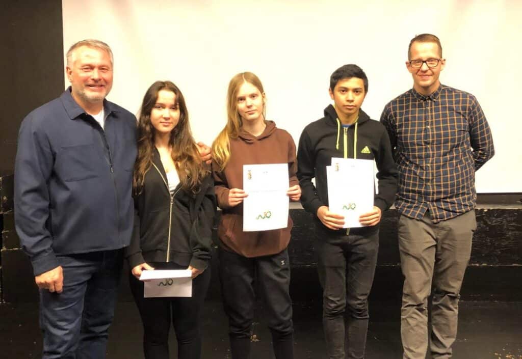 Sigmar Karlsson stigsstjóri elsta stigs og Kolbrún Vilhjálmsdóttir, stigsstjóri miðstigs, afhentu vinningshöfunum glæsileg bókaverðlaun og viðurkenningarskjal og sendir skólinn þær smásögur áfram í landskeppnina.