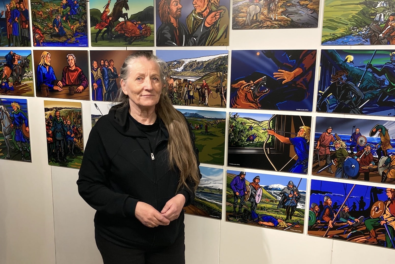 Á sýningunni eru 150 teikningar sem eru lýsingar á atburðum úr Njáls sögu. Sannkallað þrekvirki af hálfu Þórhildar, sem útskrifaðist úr Myndlista- og handíðaskóla Íslands árið 1972 og hefur starfað sem grafískur hönnuður og teiknari alla tíð síðan.
