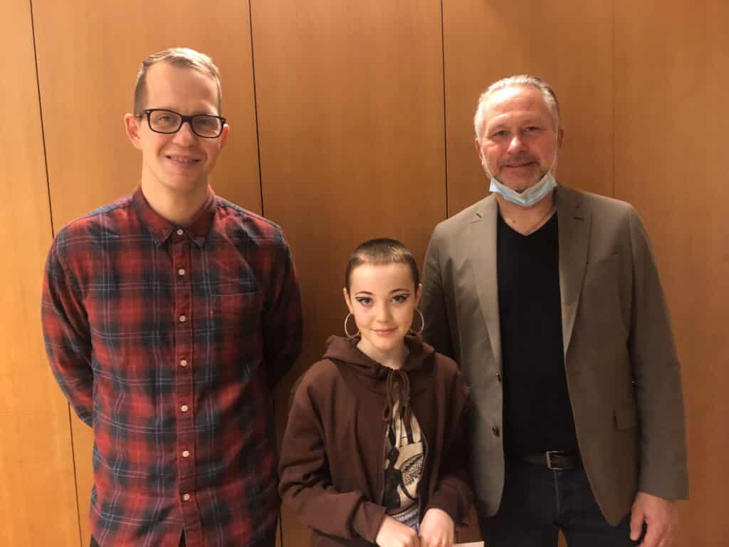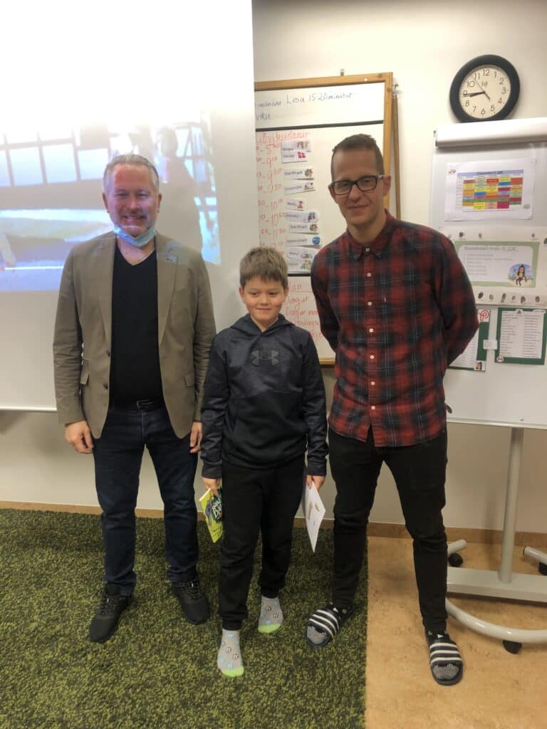 Á myndunum með nemendum eru Ólafur Jósefsson enskukennari, Sigmar Karlsson deildarstjóri miðstig og Heimir Eyvindarsson deildarstjóri elsta stigs.