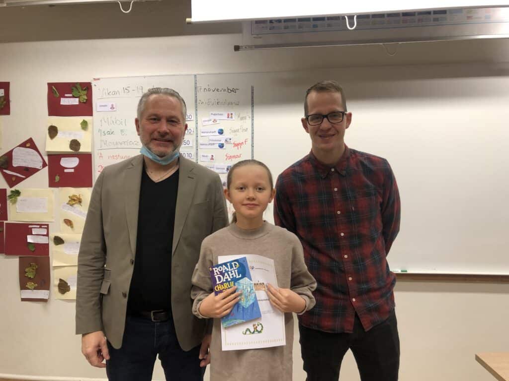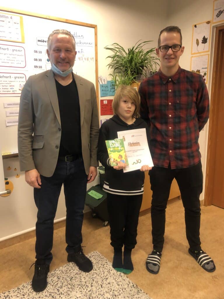 Í flokknum 5. bekkur og yngri fengu eftirtaldir nemendur bækur eftir Roald Dahl => úr 5. AJK: Hróar Ingi Hallsson, úr 5. BE: Matthías Þór Eyþórsson, og úr 5. LH: Hera Fönn Lárusdóttir.