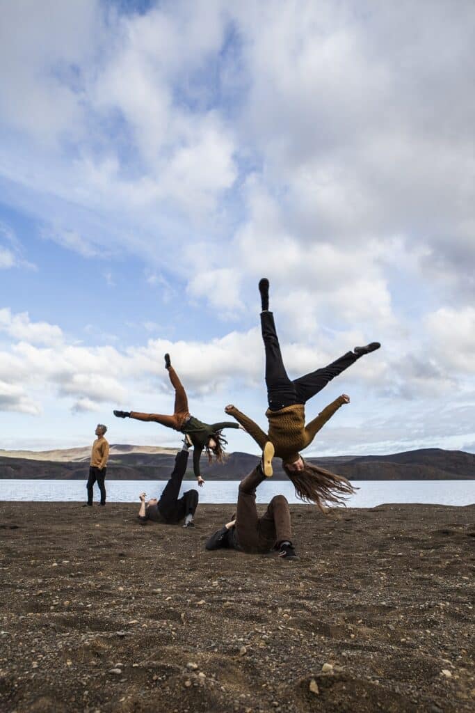 „Sirkuslistir geta vissulega verið hættulegar, en við reynum að halda raunverulegri áhættu í lágmarki með því að passa upp á allt öryggi og æfa okkur vel, og hafa skýr samskipti innan hópsins bæði á sýningum og æfingum, þannig að allt fari eins og það á að gera þegar fólk flýgur um loftið.“