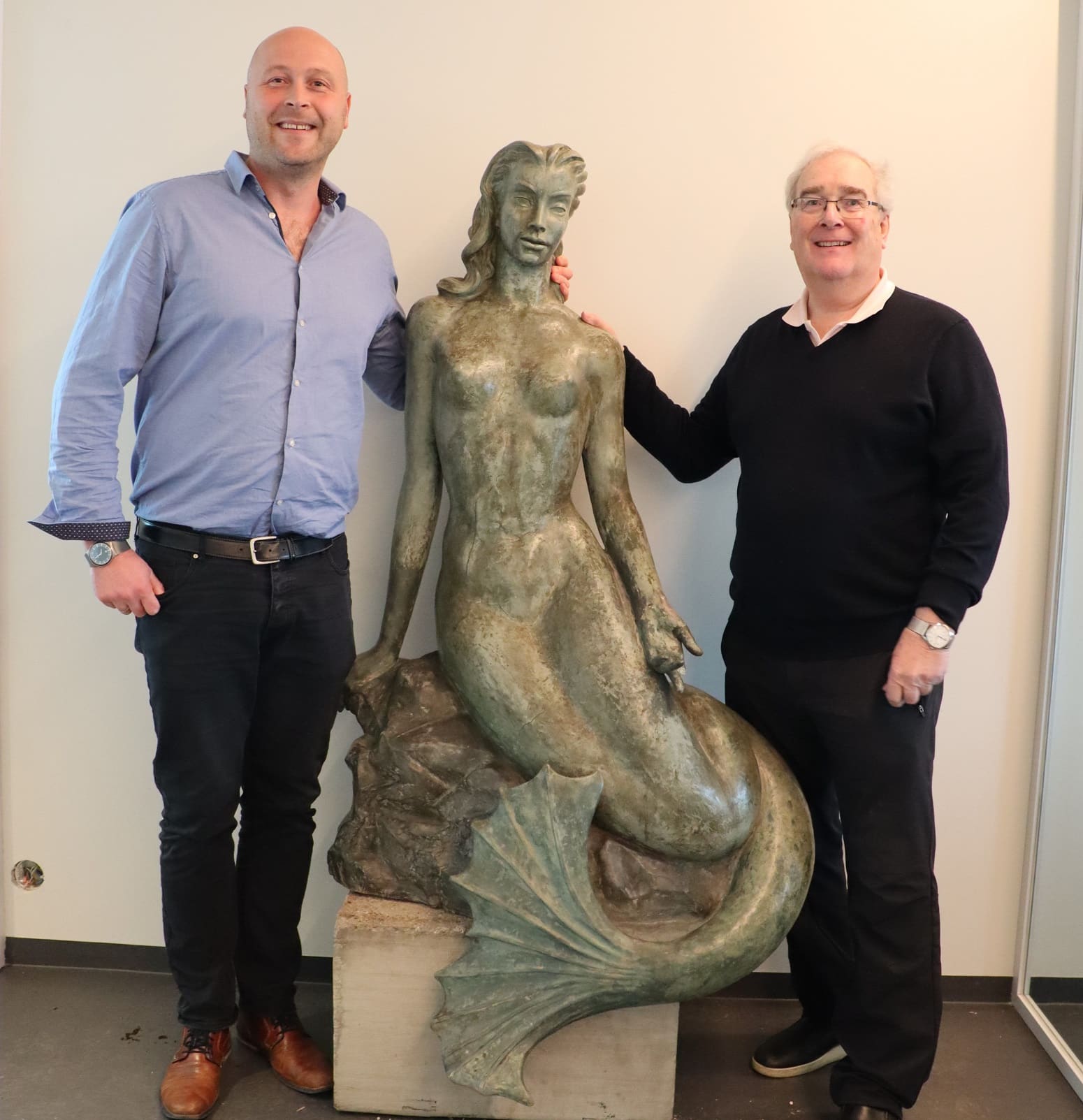 Hafmeyjan sem nú er komin á Hvolsvöll fór á uppboð hjá Gallerí Fold árið 2009 en seldist ekki þar. Nokkur tilboð komu í styttuna en verðið sem seljandinn hafði sett kom ekki. Haraldur keypti styttuna eftir uppboðið og segir ástæðuna fyrir kaupunum vara þá að honum þætti vænt um allar stúlkur í Fljótshlíðinni og vildi ekki að hún væri munaðarlaus.