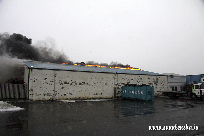 Neyðarlínan fékk boð um eldinn í Set kl. 12:48 og þegar slökkviliðið mætti á staðinn logaði skemman stafnanna á milli.